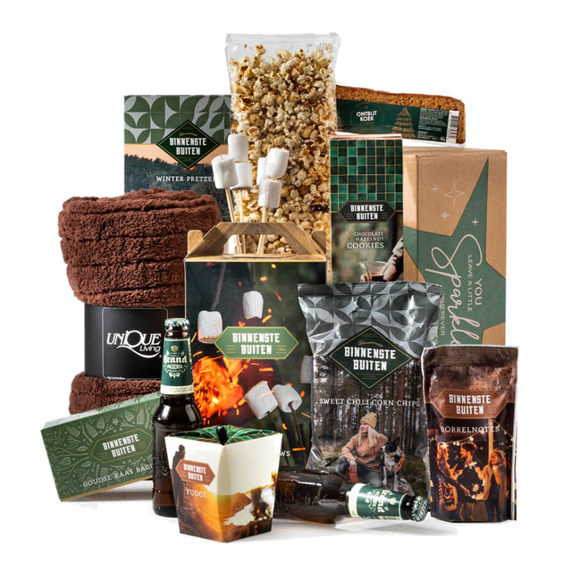 Breng warmte en gezelligheid in huis met ons sfeervolle kerstpakket binnen het thema Binnenste Buiten. Dit pakket ademt knusse momenten bij het vuur: denk aan hartige borrelhapjes, zoete traktaties en een stevig Brand biertje om het compleet te maken. Of je nu binnen op de bank kruipt met een dekentje of buiten rondom een knisperend vuurtje zit, dit pakket biedt alles voor een ontspannen, warme avond. De natuurlijke, robuuste uitstraling maakt het ook een stijlvol cadeau voor relaties, collega’s of vrienden.