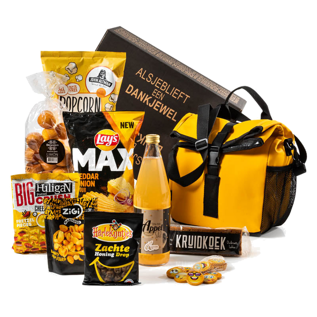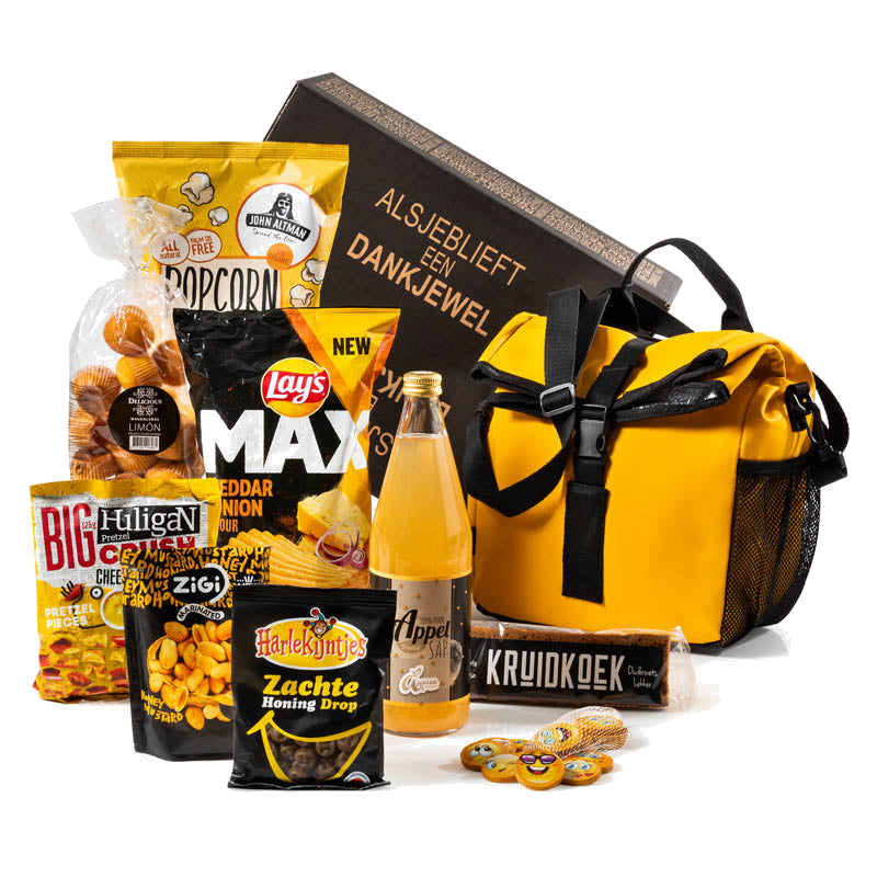 Verras klanten, collega’s of relaties met dit trendy kerstpakket waarin comfort, smaak en slimme functionaliteit samenkomen. Centraal staat een opvallende gele koel- en schoudertas die je makkelijk aan de fiets bevestigt: praktisch voor onderweg, ideaal voor werk of boodschappen en een vrolijke eyecatcher tijdens de feestdagen. De tas is zorgvuldig gevuld met een aantrekkelijke mix van zoete en hartige lekkernijen, perfect om te delen of zelf van te genieten.