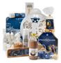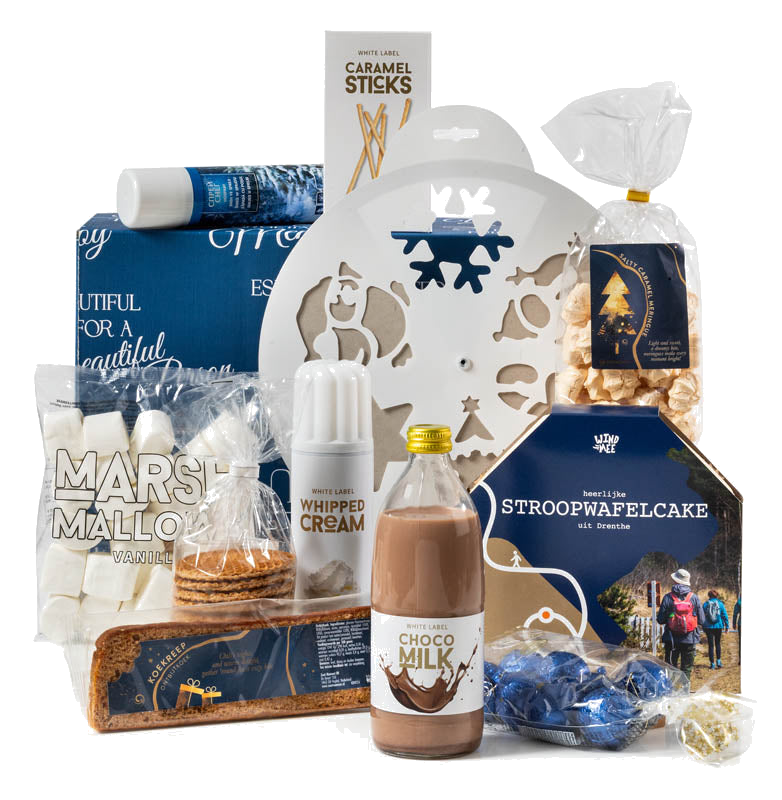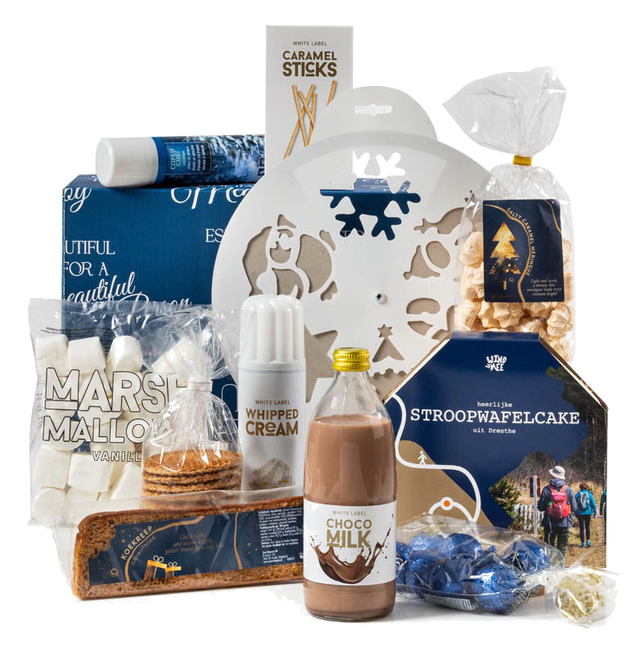 Breng warmte en gezelligheid in huis met dit charmante, blauw getinte kerstpakket voor de hele familie. Perfect voor koude winterdagen, gevuld met klassieke Nederlandse lekkernijen en sfeervolle accessoires waarmee je direct kerstsfeer creëert. Geniet samen van romige chocomelk met luchtige slagroom, krokante stroopwafels en zachte marshmallows bij de open haard. Versier de ramen met het bijgeleverde sjabloon en kunstsneeuw en laat de magie van kerst door je huis dwarrelen.