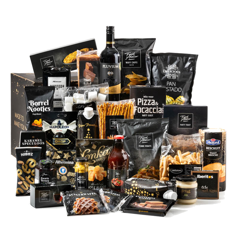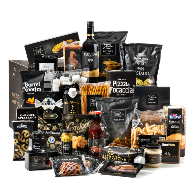 De feestbox is samengesteld met oog voor smaak en afwisseling, zodat er voor iedereen iets lekkers tussen zit. Ideaal om direct te delen aan tafel of om in fases van te genieten tijdens feestelijke dagen. De zwarte, chique uitstraling maakt het pakket bovendien een stijlvolle verrassing.