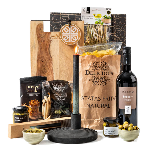 Creëer direct een stijlvolle borrelervaring met dit verfijnde borrelpakket: perfect voor feestjes, een romantisch diner of als exclusief cadeau. De zwarte kandelaar met bijpassende dinerkaarsen zorgt voor een warme, elegante sfeer; de robuuste RoseWood serveerplank met metalen handvat en de groene serveerschaaltjes maken presenteren moeiteloos chic. Geniet samen van de rijke, kruidige tonen van de Italiaanse rode Caleo Primitivo en proef de zorgvuldig gekozen hartige hapjes: van pittige pesto en zoute pretzelsticks tot knapperige patatas fritas en mediterrane olijven. Dit pakket combineert smaakvolle eenvoud met aandacht voor stijl — klaar om te geven of direct te serveren.