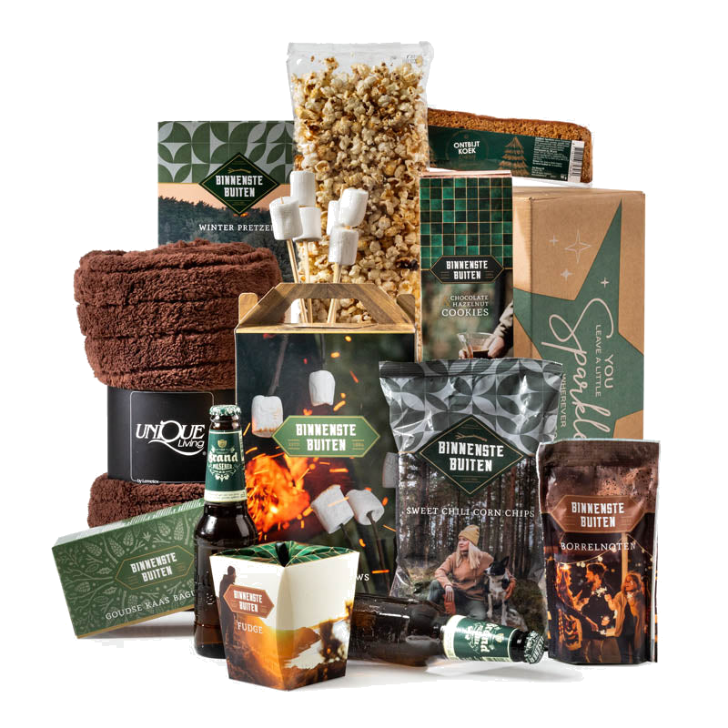 Breng warmte en gezelligheid in huis met ons sfeervolle kerstpakket binnen het thema Binnenste Buiten. Dit pakket ademt knusse momenten bij het vuur: denk aan hartige borrelhapjes, zoete traktaties en een stevig Brand biertje om het compleet te maken. Of je nu binnen op de bank kruipt met een dekentje of buiten rondom een knisperend vuurtje zit, dit pakket biedt alles voor een ontspannen, warme avond. De natuurlijke, robuuste uitstraling maakt het ook een stijlvol cadeau voor relaties, collega’s of vrienden.